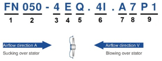 Вентиляторы оборудованы одно- и трехфазными двигателями с внешним ротором, контролируемые по скорости вращения. Класс защиты IP54. Лопасти рабочего колеса для диаметров до 450 мм выполнены из штампованной стали, 450 – 630 мм из штампованного алюминия,710 – 1000 мм литые из алюминия.